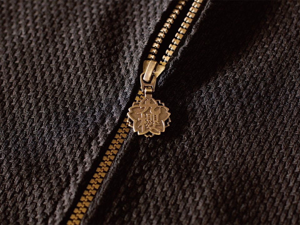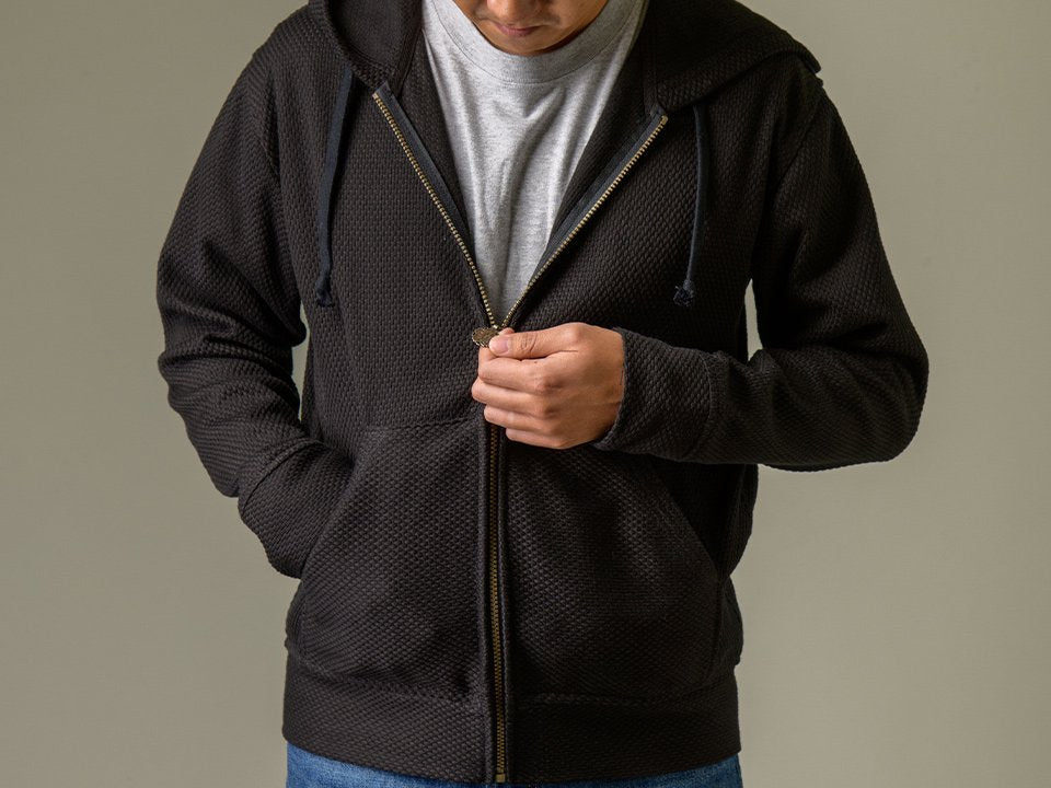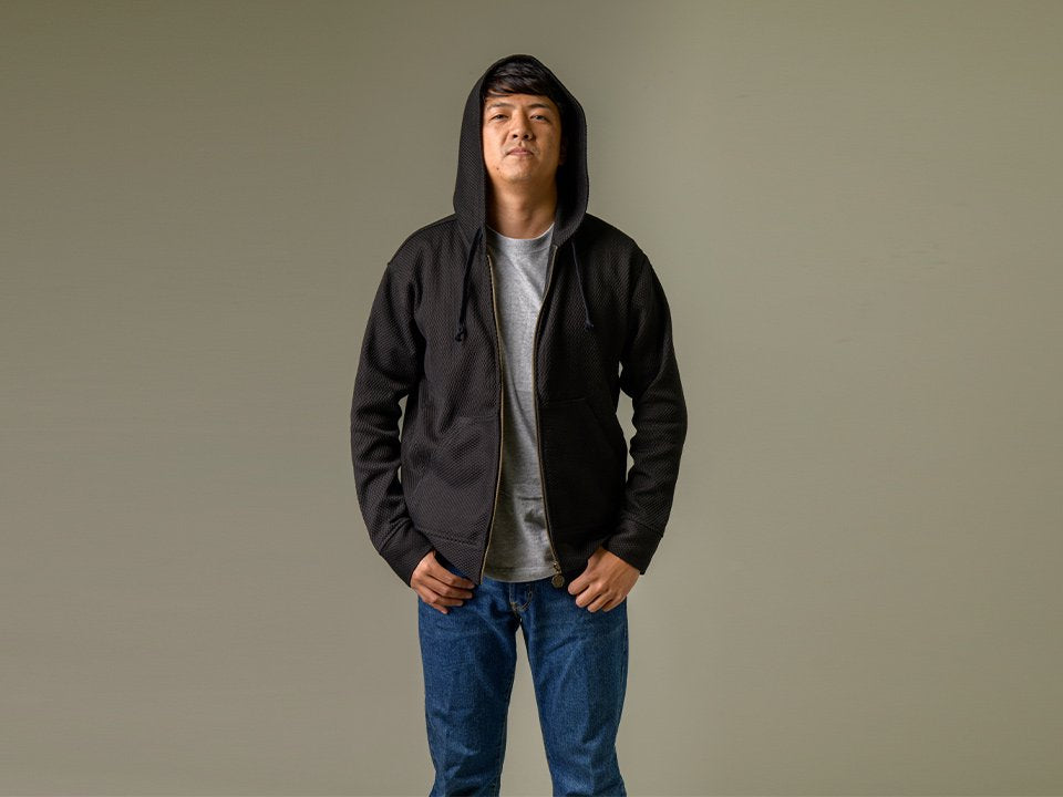 Black dyed all-Kusakura Sashiko fabric hoodie. The cuffs and hem are made of Sashiko fabric on purpose.